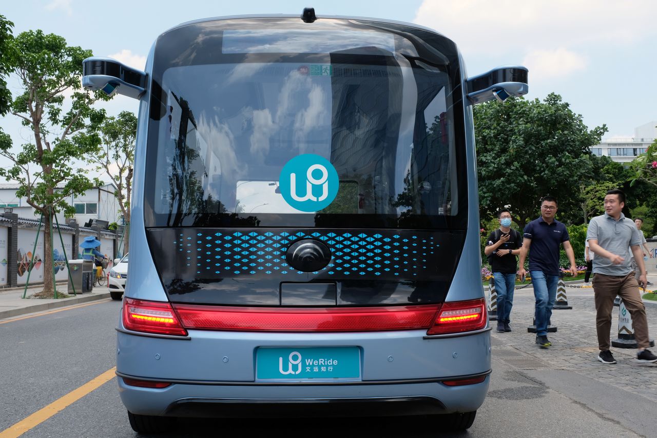 People walk past a WeRide autonomous driving robobus near its office in Guangzhou, Guangdong province, China May 11, 2021. Picture taken May 11, 2021. REUTERS/Yilei Sun