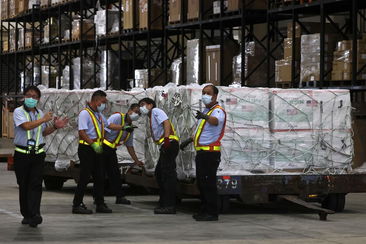 FILE PHOTO: Workers transport Moderna vaccines against the coronavirus disease (COVID-19) shipped from the United States, to Taiwan Air Cargo Terminal at the Taoyuan International Airport in Taoyuan, Taiwan, June 20, 2021. REUTERS/Ann Wang