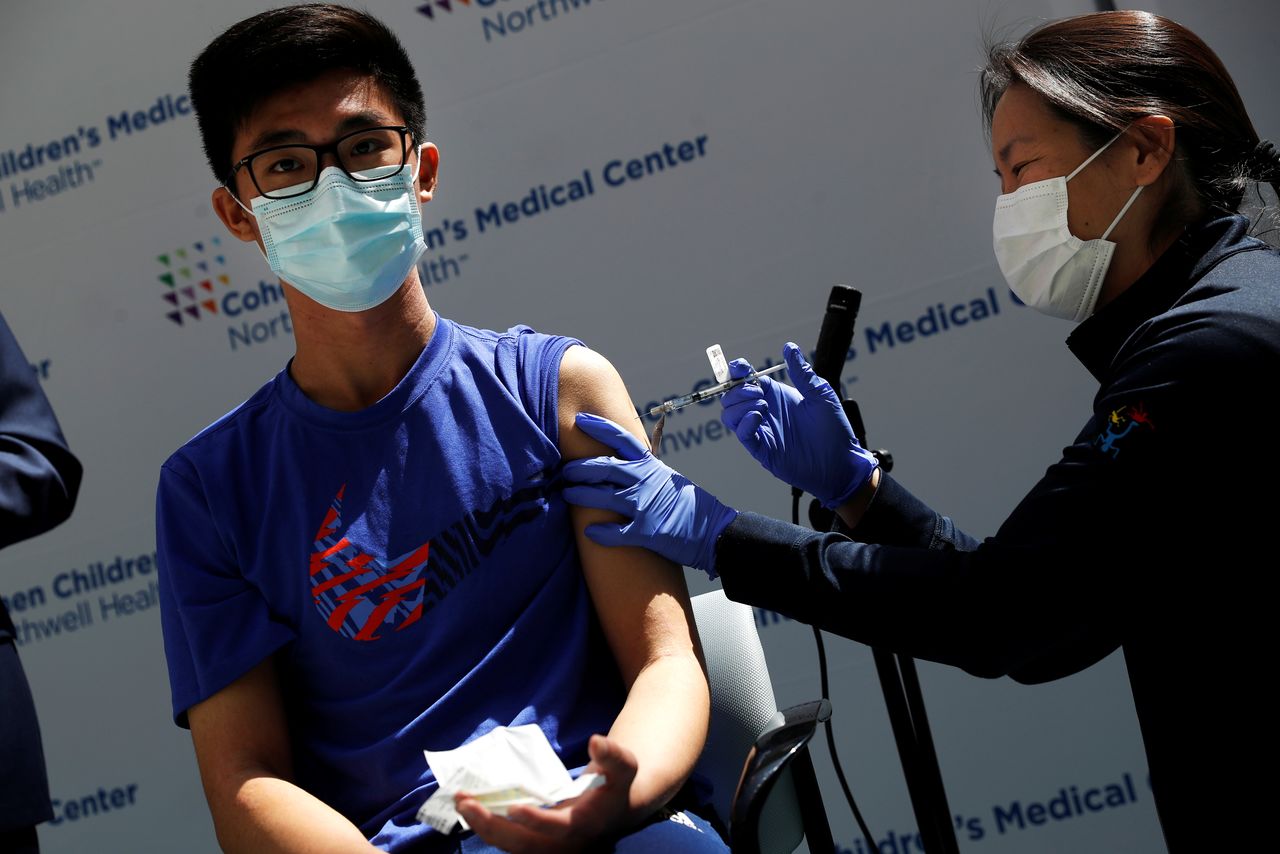 FILE PHOTO: Thomas Lo (15) receives a dose of the Pfizer-BioNTech vaccine for the coronavirus disease (COVID-19) at Northwell Health's Cohen Children's Medical Center in New Hyde Park, New York, U.S., May 13, 2021. REUTERS/Shannon Stapleton