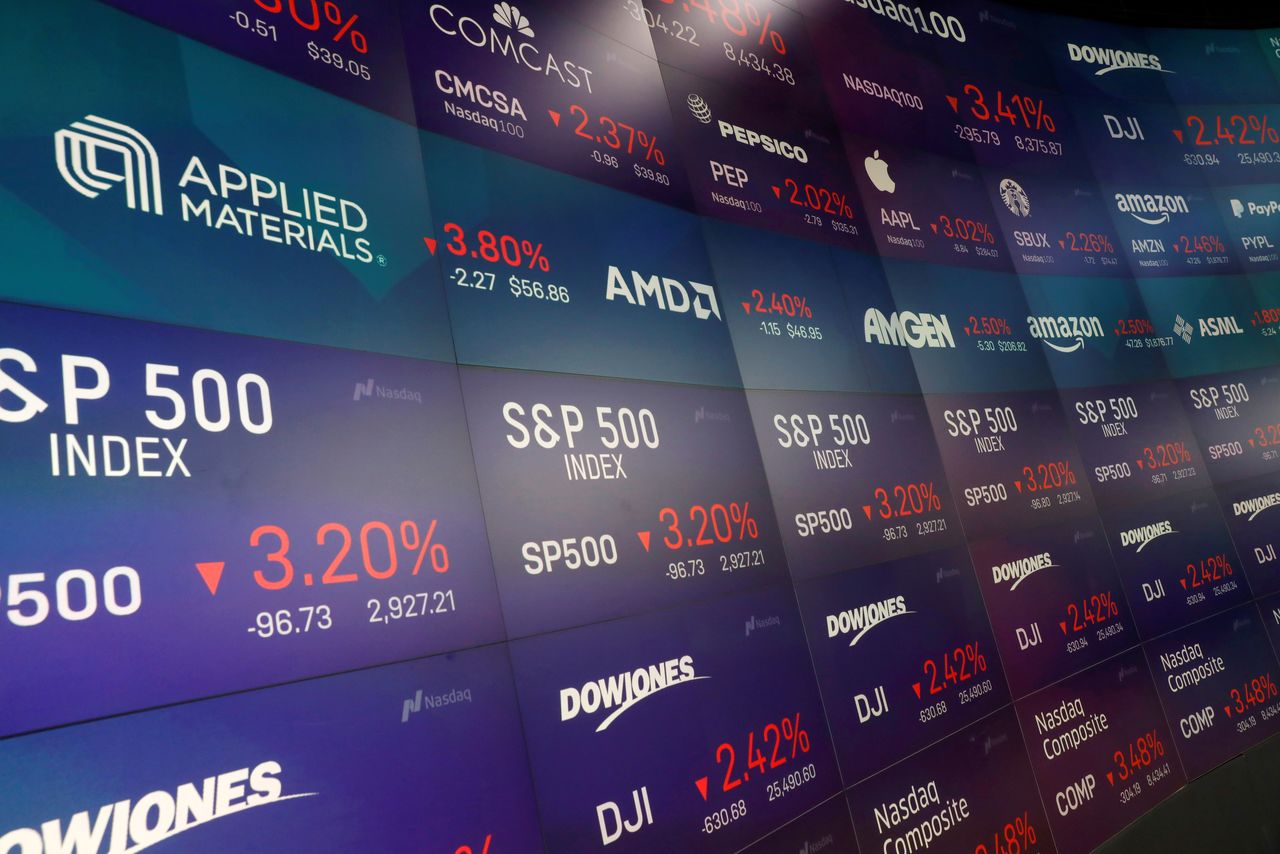 FILE PHOTO: Trading information is displayed on the screens at the Nasdaq Market Site in Times Square, New York City, New York, U.S., March 6, 2020. REUTERS/Andrew Kelly