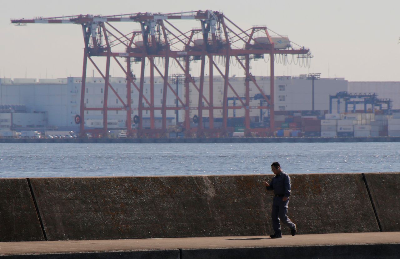 FILE PHOTO: A man walks in front of containers and cranes at an industrial port in Tokyo, Japan September 29, 2017. REUTERS/Toru Hanai