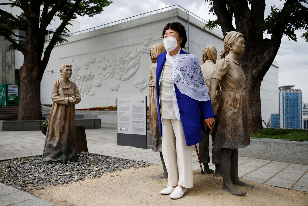 A former South Korean "comfort woman" poses for photographs at the Seoul Comfort Women Memorial in Seoul, South Korea, June 29, 2021. REUTERS/Kim Hong-Ji