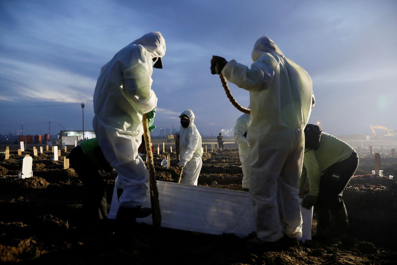 FILE PHOTO: Gravediggers wearing personal protective equipment (PPE) burry a coffin of a coronavirus disease (COVID-19) victim, at the burial area provided by the government for COVID-19 victims, in Jakarta, Indonesia, June 28, 2021.REUTERS/Willy Kurniawan