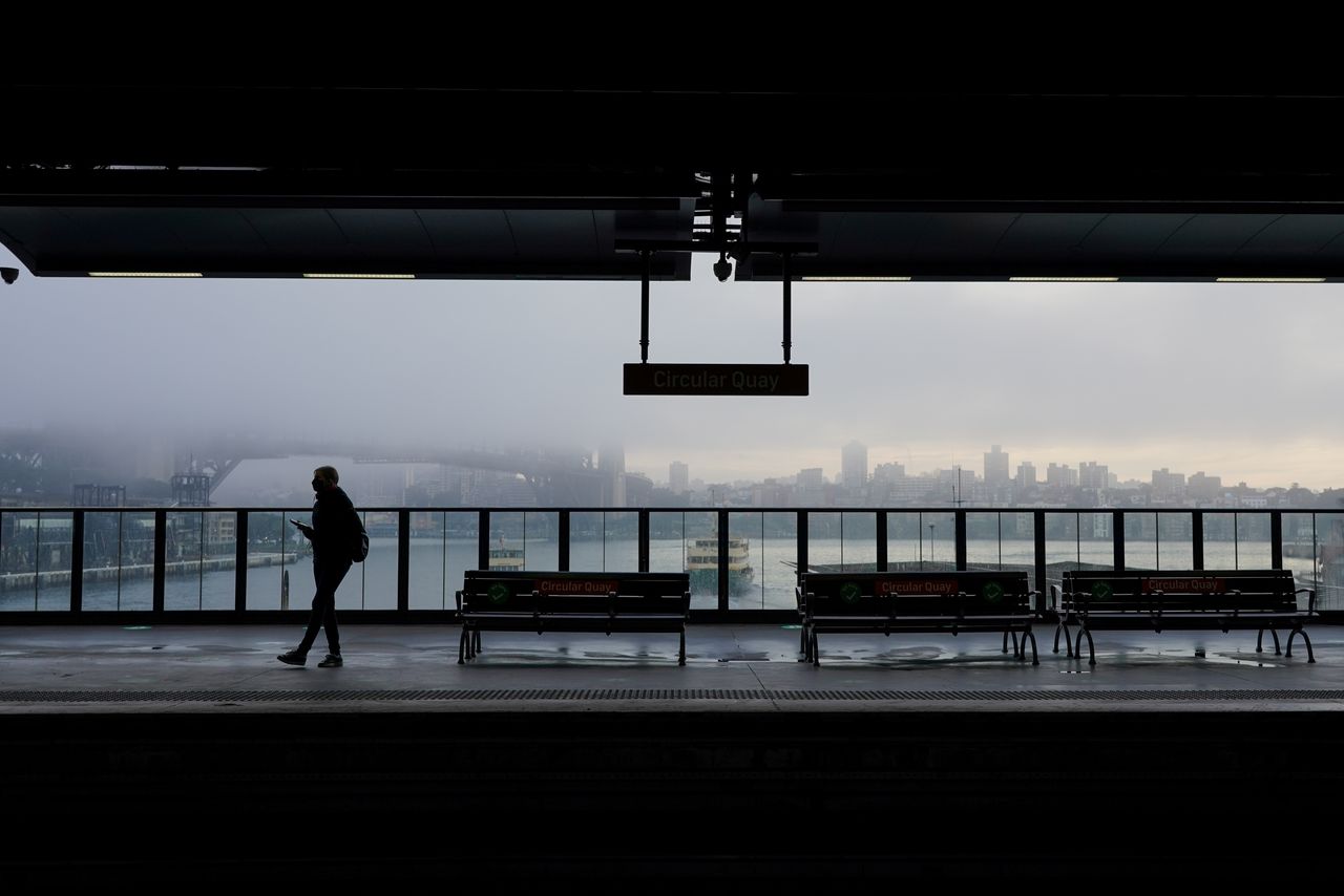 FILE PHOTO: A lone passenger wearing a protective face mask stands on a deserted train platform at Circular Quay during a lockdown to curb the spread of a coronavirus disease (COVID-19) outbreak in Sydney, Australia, July 1, 2021. REUTERS/Loren Elliott