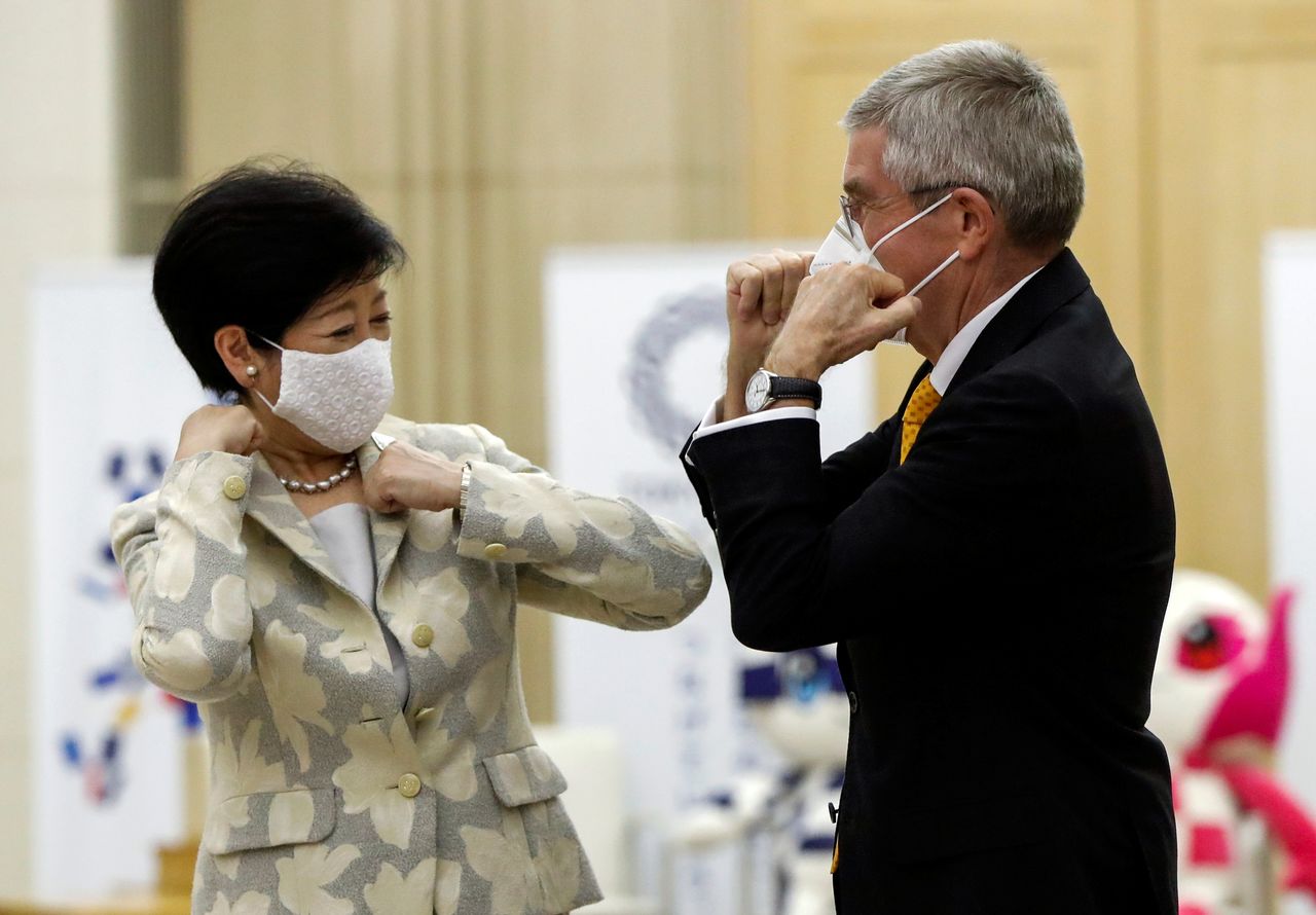 FILE PHOTO: Tokyo Governor Yuriko Koike and Thomas Bach, President of the International Olympic Committee (IOC), bump elbows at the start of their talks at Tokyo Metropolitan Government Office Building in Tokyo, Japan November 16, 2020. REUTERS/Issei Kato