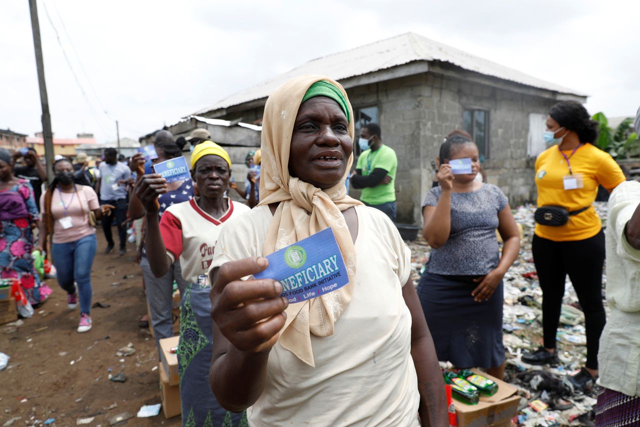 A woman holds her food ticket as people queue for food parcels during distribution by volunteers of the Lagos food bank initiative in a community in Oworoshoki, Lagos, Nigeria July 10, 2021. REUTERS/Temilade Adelaja