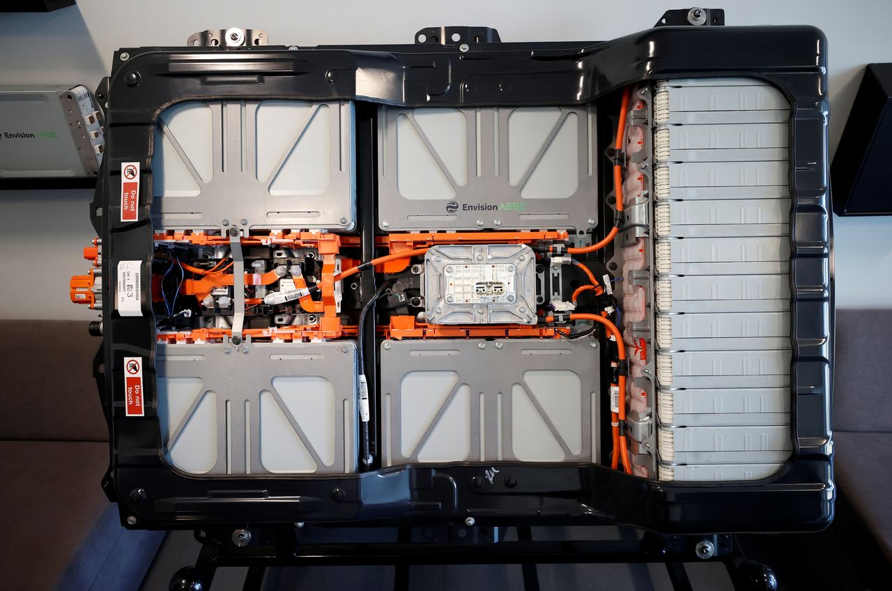 FILE PHOTO: A cross-section of a completed battery for a Nissan Leaf car is seen inside the Envision battery manufacturing plant at Nissan's Sunderland factory, Britain, July 1, 2021. REUTERS/Phil Noble -/File Photo
