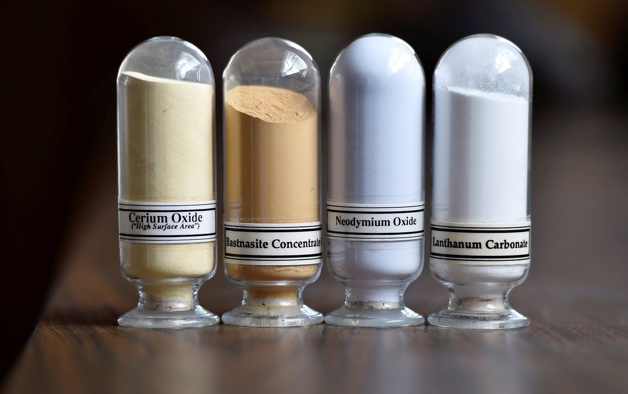 FILE PHOTO: Samples of rare earth minerals from left, Cerium oxide, Bastnasite, Neodymium oxide and Lanthanum carbonate are on display during a tour of Molycorp's Mountain Pass Rare Earth facility in Mountain Pass, California June 29, 2015. REUTERS/David Becker -/File Photo