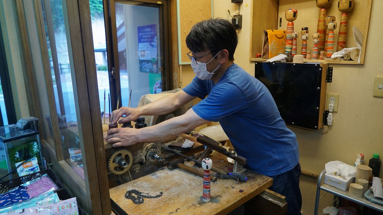 Sixth generation kokeshi maker Kunitoshi Abe cleans up after making a kokeshi at his shop in Tsuchiyu Onsen Machi, Fukushima, Fukushima Prefecture, Japan July 20, 2021. REUTERS/Joseph Campbell