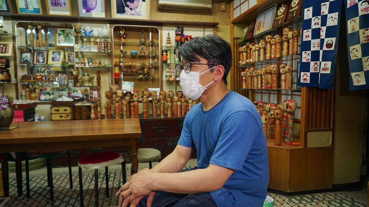 Sixth generation kokeshi maker Kunitoshi Abe sits in his shop at Tsuchiyu Onsen Machi, Fukushima, Fukushima Prefecture, Japan July 20, 2021. REUTERS/Joseph Campbell