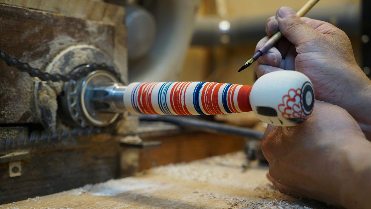 Sixth generation kokeshi maker Kunitoshi Abe paints the body for a kokeshi at his shop in Tsuchiyu Onsen Machi, Fukushima, Fukushima Prefecture, Japan July 20, 2021. REUTERS/Joseph Campbell