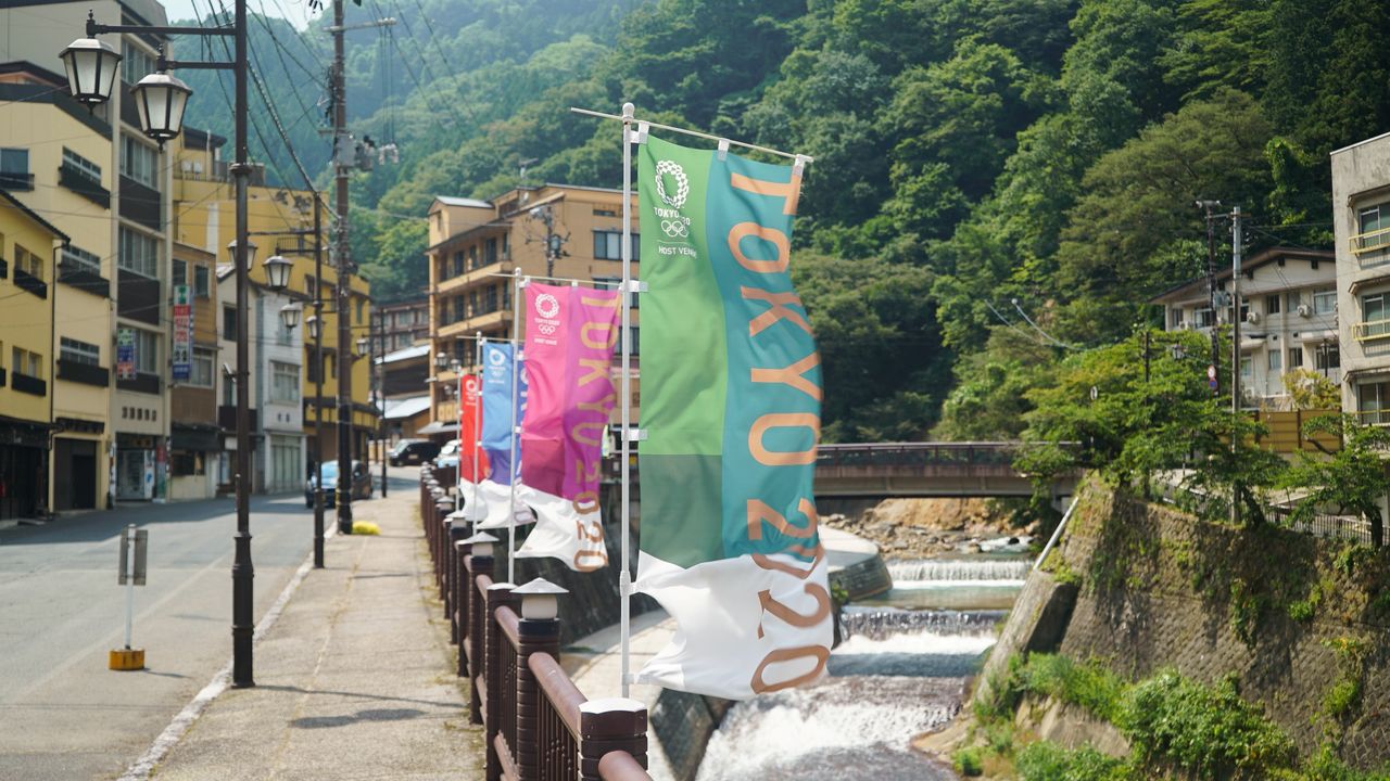 Tokyo 2020 banners flutter along a riverwalk in Tsuchiyu Onsen Machi, Fukushima, Fukushima Prefecture, Japan July 20, 2021. REUTERS/Joseph Campbell