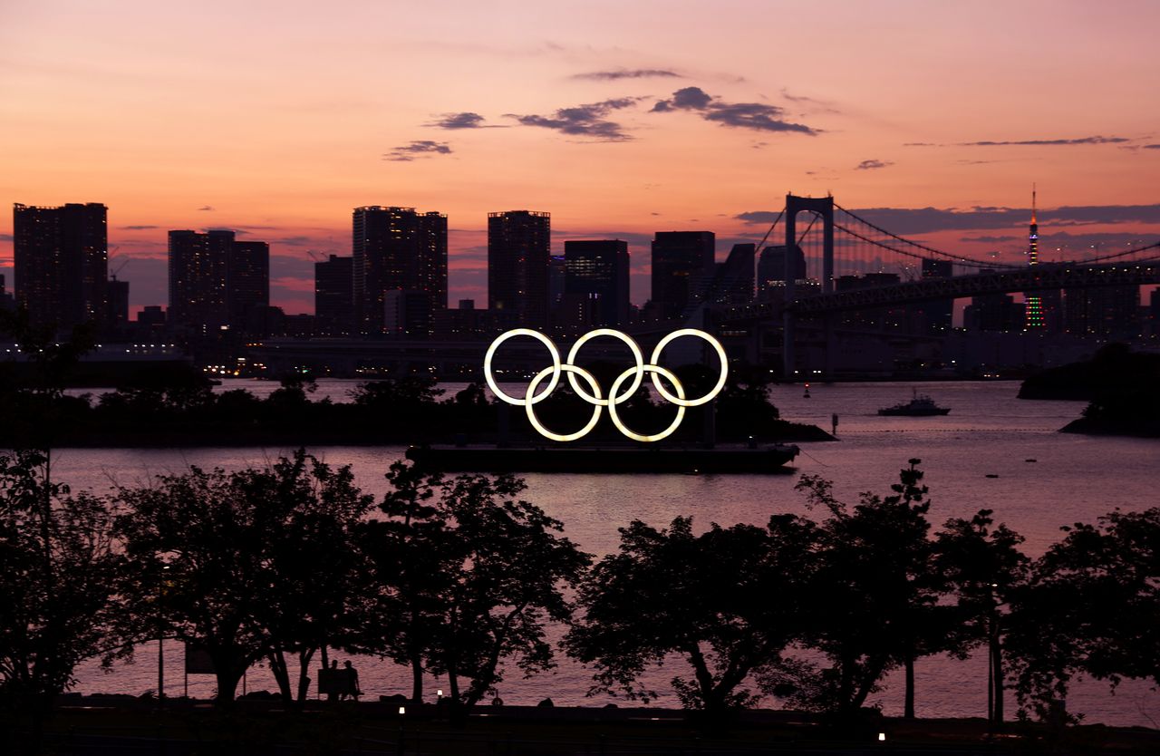The Olympic Rings are seen in front of the skyline during sunset one night ahead of the official opening of the Tokyo 2020 Olympic Games in Tokyo, Japan, July 22, 2021. REUTERS/Kai Pfaffenbach