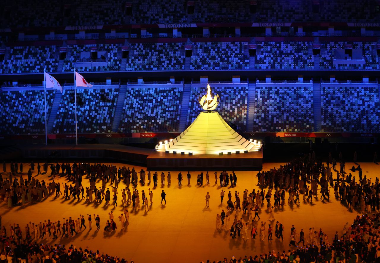 About half an hour into the ceremony, giant wooden rings and paper lanterns traditional at Japanese summer festivals were carried out into the stadium, recalling that moment of triumph.