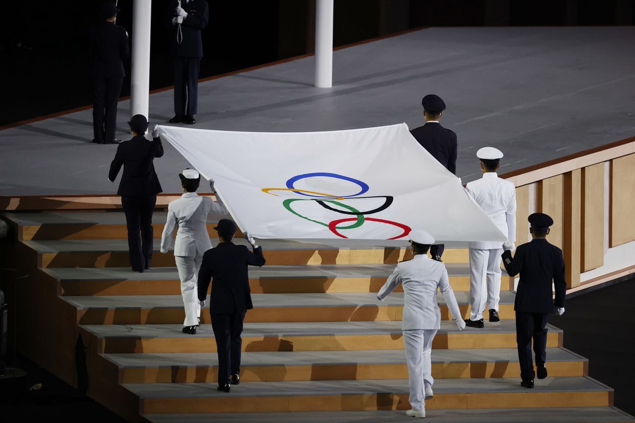 Tokyo 2020 Olympics - The Tokyo 2020 Olympics Opening Ceremony - Olympic Stadium, Tokyo, Japan - July 23, 2021. The Olympic flag is carried during the opening ceremony REUTERS/Phil Noble