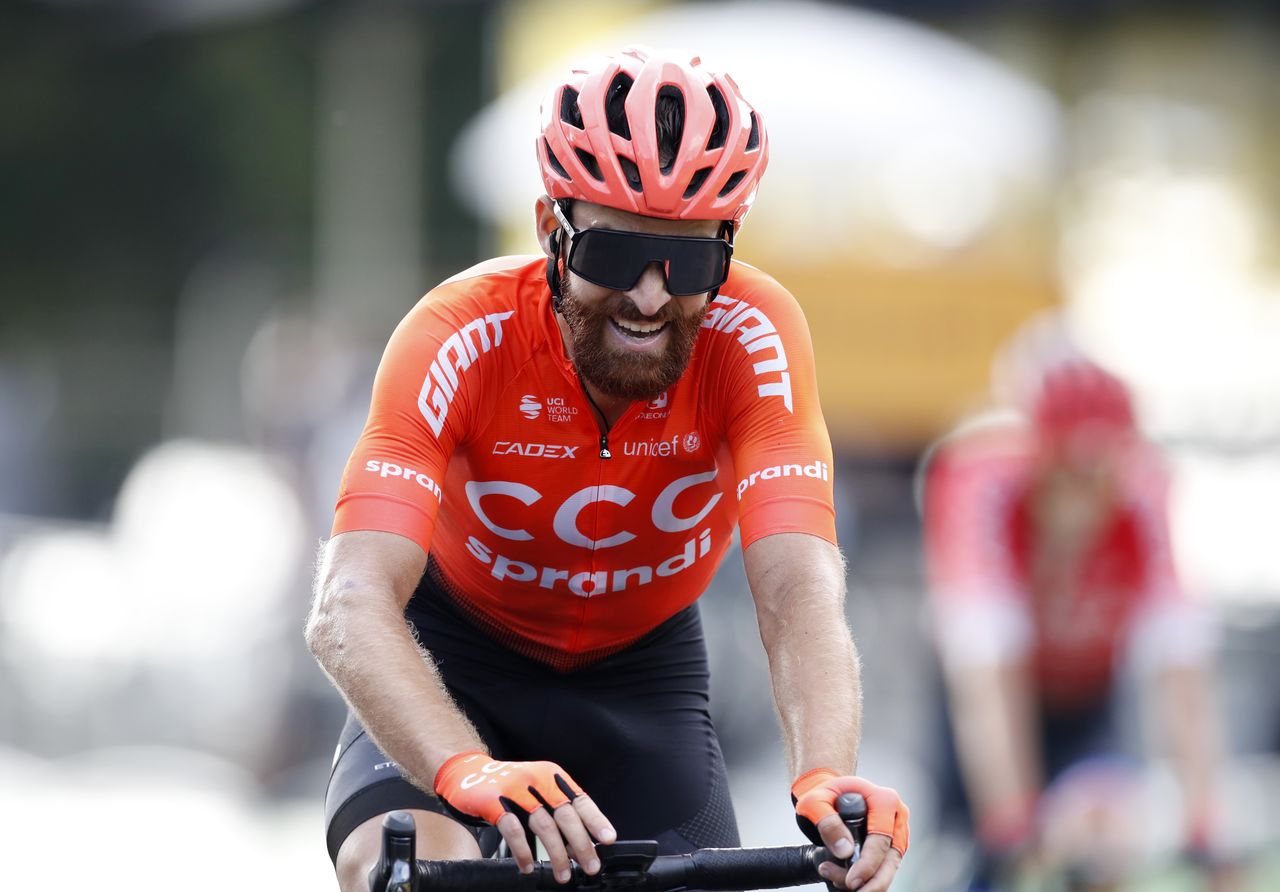 FILE PHOTO: Cycling - Tour de France - Stage 16 - La Tour-du-Pin to Villard-de-Lans - France - September 15, 2020. CCC Team rider Simon Geschke of Germany finishes. Pool via REUTERS/Sebastien Nogier