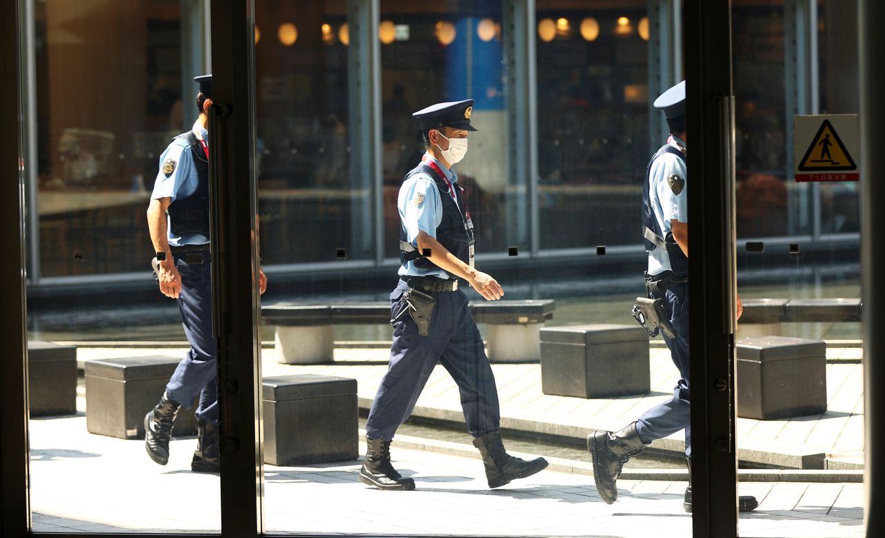 FILE PHOTO: Police officers walk in a line as they observe social distancing, ahead of the Tokyo 2020 Olympic Games that were postponed to 2021 due to the coronavirus disease (COVID-19) pandemic, in Tokyo, Japan, July 22, 2021. REUTERS/Siphiwe Sibeko