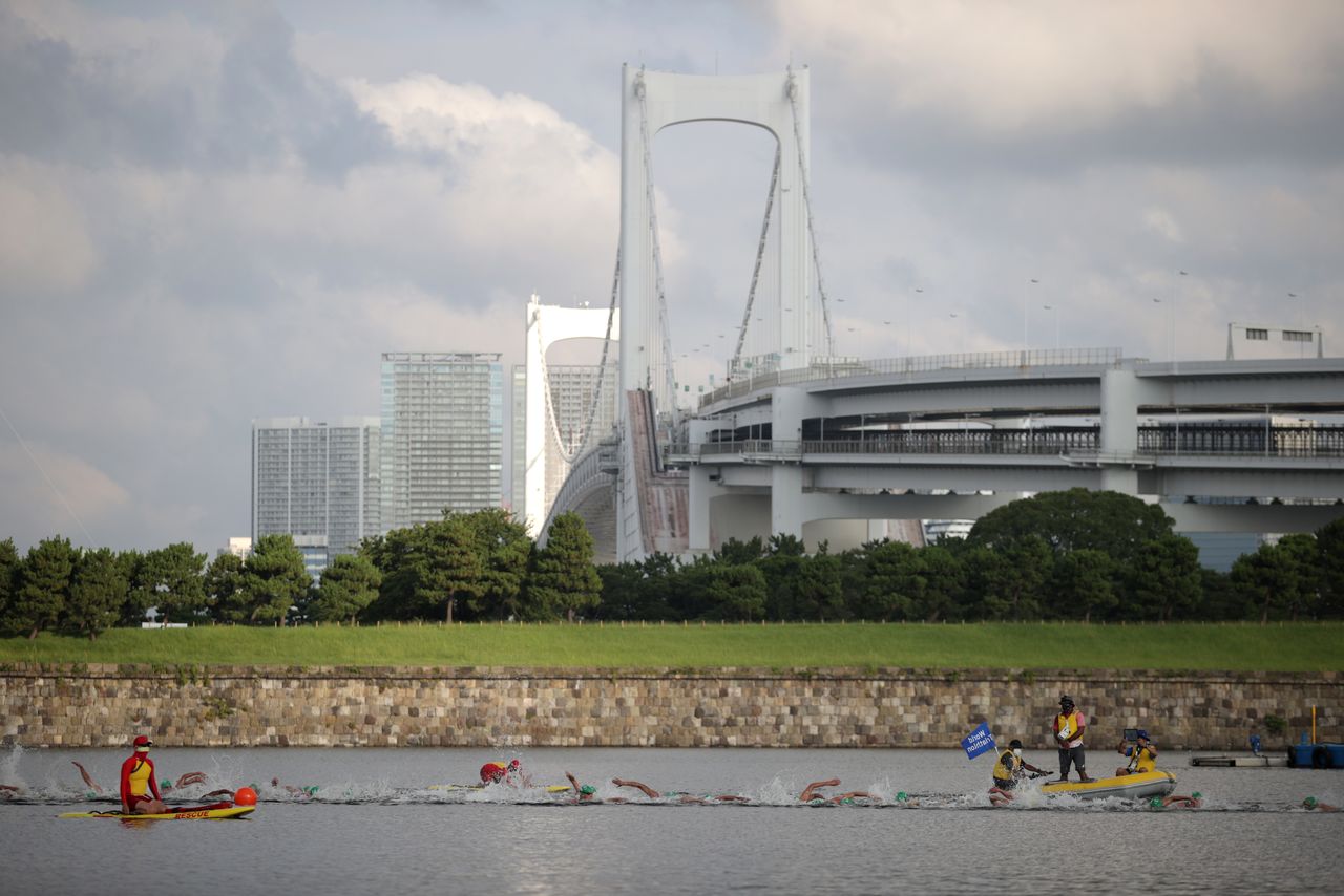 Fifty-six men lined up on a pontoon in Tokyo Bay for the 06.30 local start but as the starter sent them away for the opening 1,500 metre swim leg, around a third found their way blocked by a camera boat.