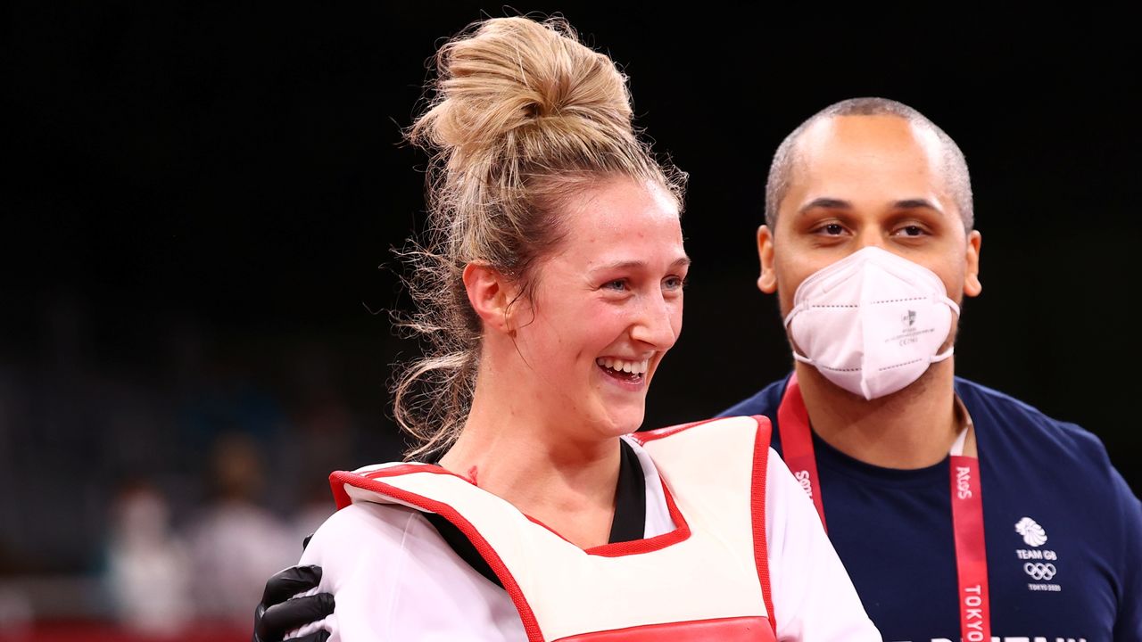 Tokyo 2020 Olympics - Taekwondo - Women’s Welterweight 57-67kg - Semifinal - Makuhari Messe Hall A, Chiba, Japan - July 26, 2021. Lauren Williams of Britain celebrates with coach after winning REUTERS/Murad Sezer