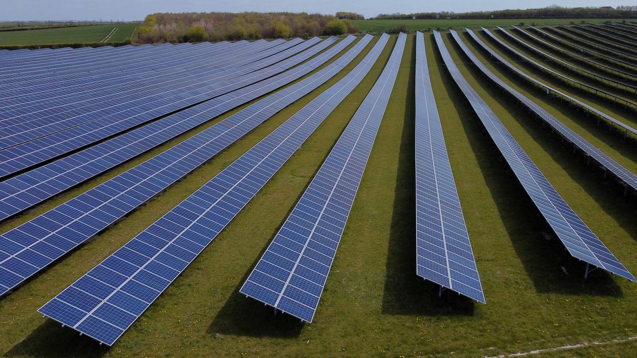 FILE PHOTO: A field of solar panels is seen near Royston, Britain, April 26, 2021. Picture taken with a drone. REUTERS/Matthew Childs/File Photo