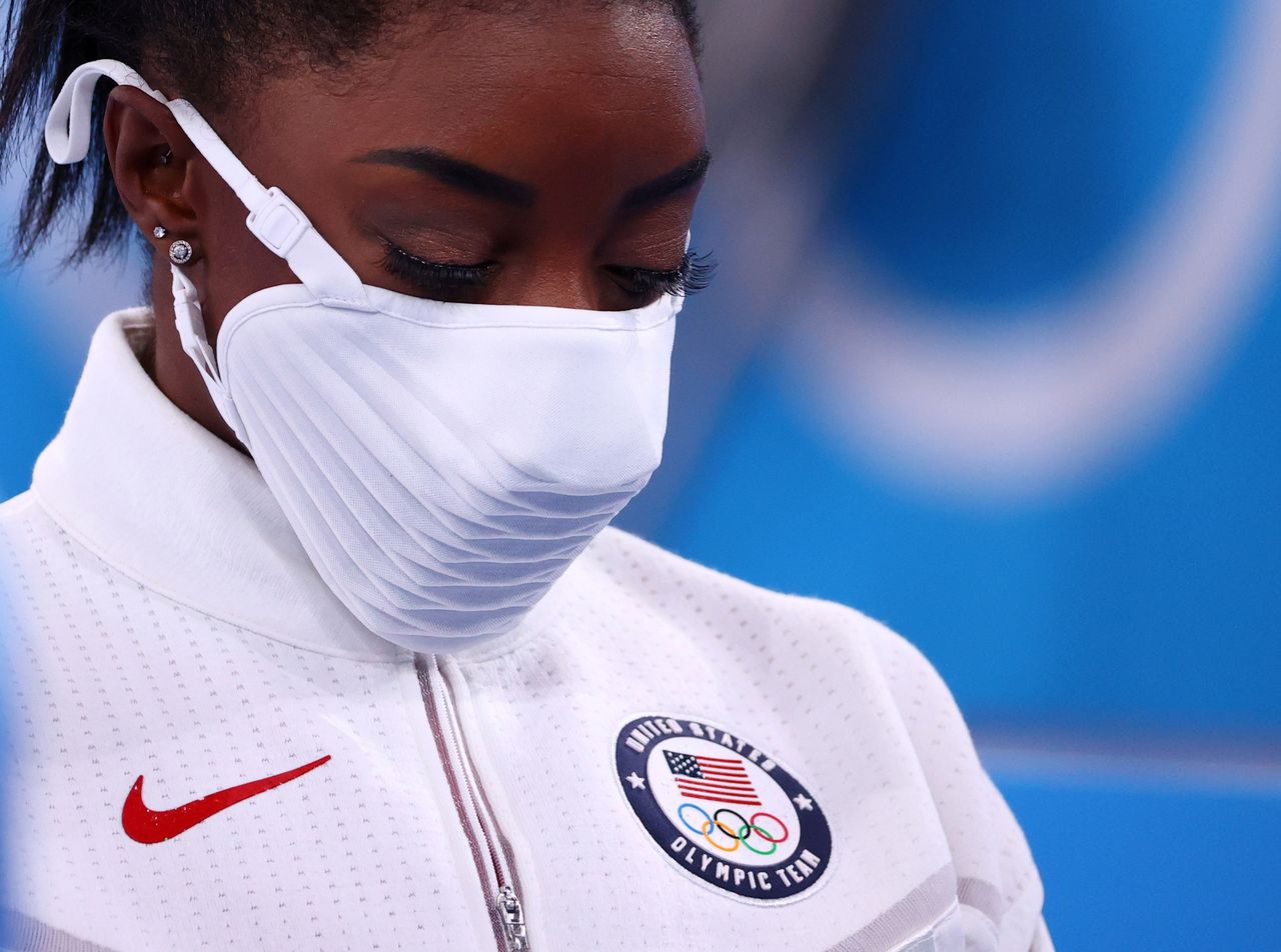 Tokyo 2020 Olympics - Gymnastics - Artistic - Women’s Team - Final - Ariake Gymnastics Centre, Tokyo, Japan - July 27, 2021. Silver medallist Simone Biles of the United States wearing a protective face mask looks down. REUTERS/Lindsey Wasson