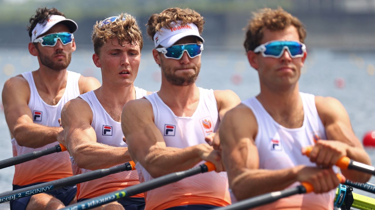 Tokyo 2020 Olympics - Rowing - Men’s Quadruple Sculls - Final A - Sea Forest Waterway, Tokyo, Japan - July 28, 2021. Dirk Uittenbogaard of the Netherlands, Abe Wiersma of the Netherlands, Tone Wieten of the Netherlands and Koen Metsemakers of the Netherlands in action REUTERS/Leah Millis