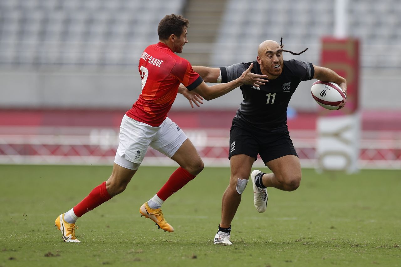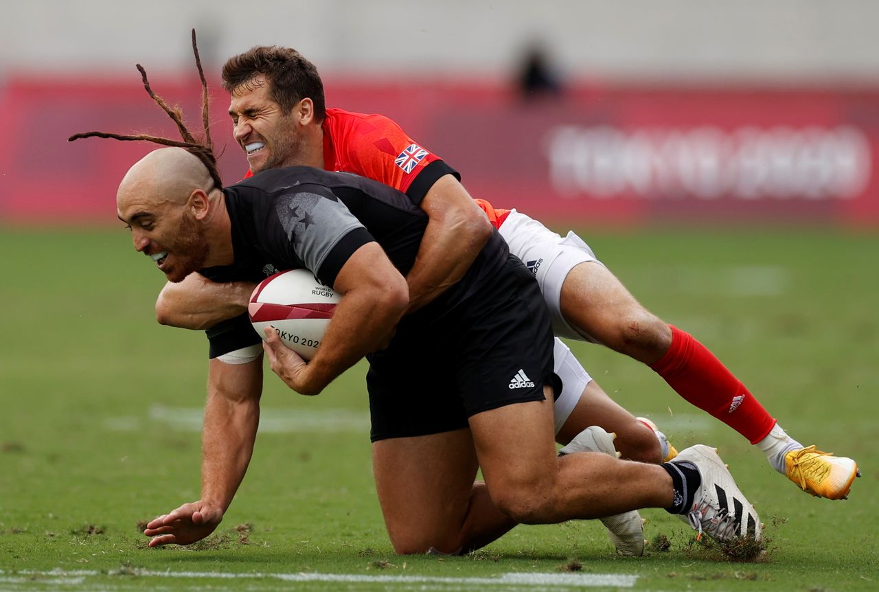 Tokyo 2020 Olympics - Rugby Sevens - Men - Semifinal - New Zealand v Britain - Tokyo Stadium - Tokyo, Japan - July 28, 2021. Joe Webber of New Zealand in action with Ollie Lindsay-Hague of Britain. REUTERS/Phil Noble
