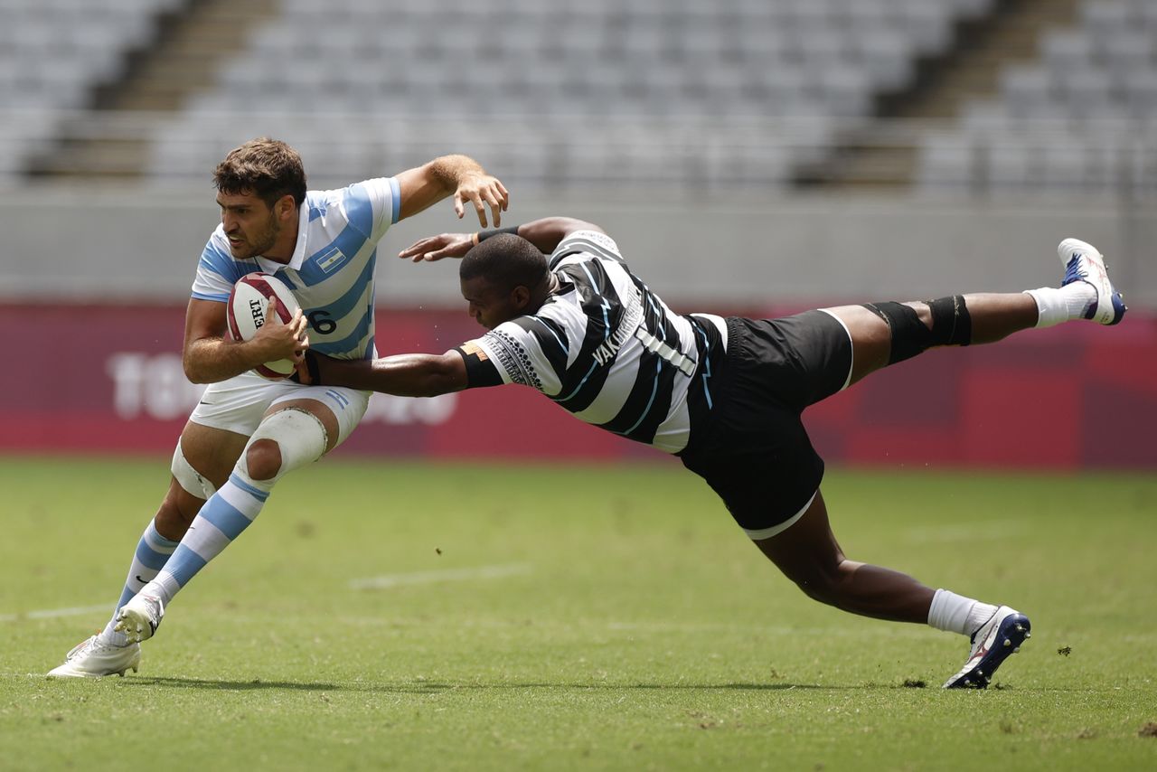 Tokyo 2020 Olympics - Rugby Sevens - Men - Semifinal - Argentina v Fiji - Tokyo Stadium - Tokyo, Japan - July 28, 2021. Felipe del Mestre of Argentina tries to stop Jiuta Wainiqolo of Fiji as he scores a try. REUTERS/Phil Noble