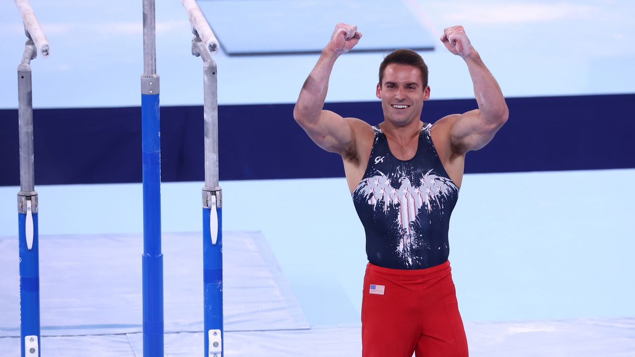 Tokyo 2020 Olympics - Gymnastics - Artistic - Men’s Individual All-Around - Final - Ariake Gymnastics Centre, Tokyo, Japan - July 28, 2021. Samuel Mikulak of the United States celebrates after performing on the parallel bars. REUTERS/Mike Blake