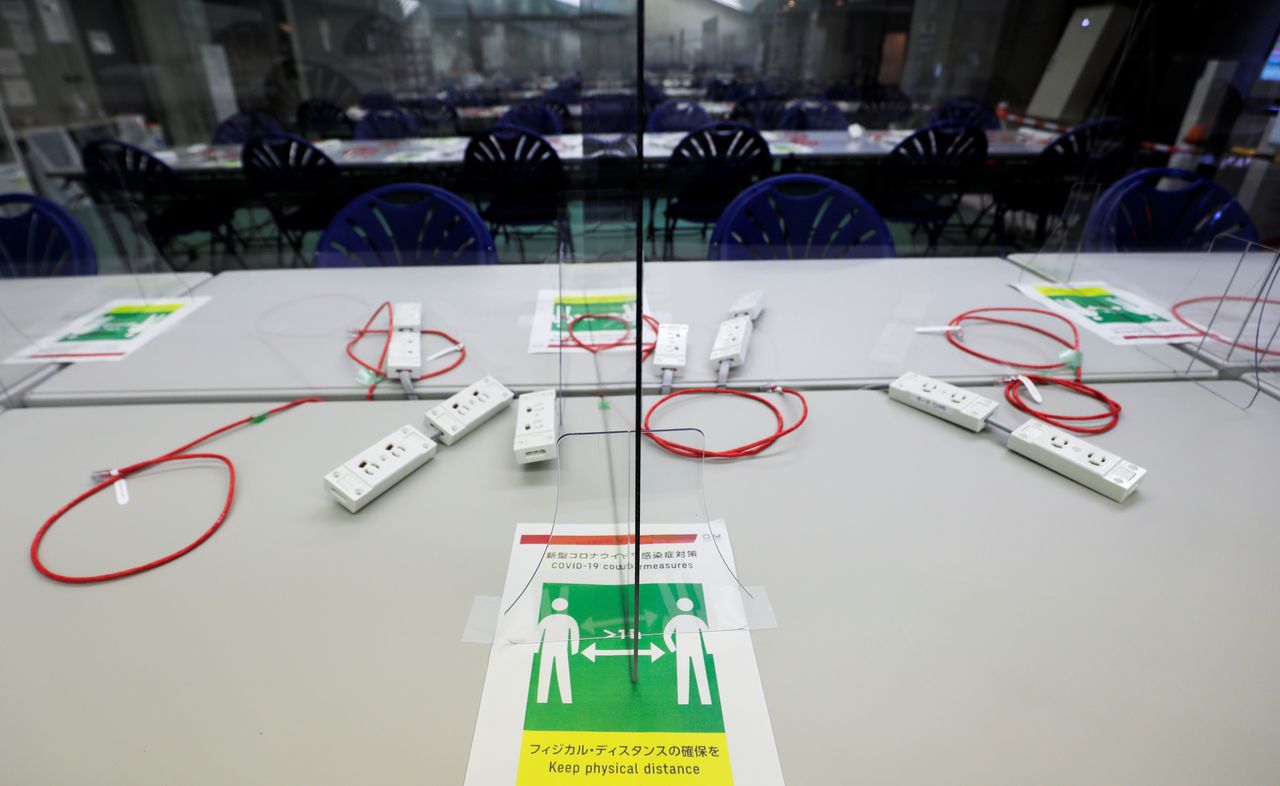 FILE PHOTO: A sign with a coronavirus disease (COVID-19) safety instruction is seen at the media center in Miyagi Stadium, during the Tokyo 2020 Olympic Games, in Sendai, Miyagi prefecture, Japan, July 26, 2021. REUTERS/Amr Abdallah Dalsh