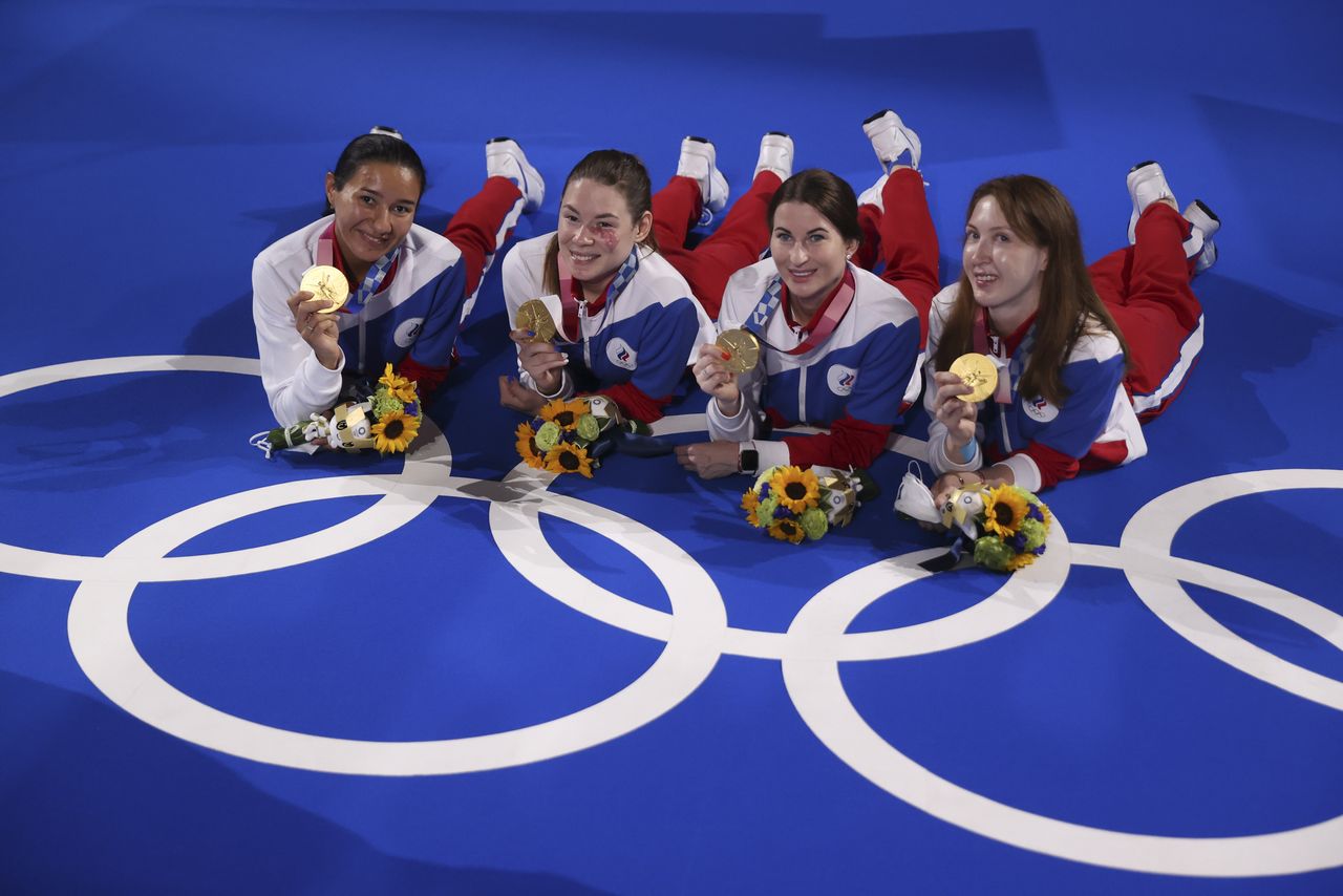 Tokyo 2020 Olympics - Fencing - Women’s Team Foil - Medal Ceremony - Makuhari Messe Hall B - Chiba, Japan - July 29, 2021. Gold medallists Inna Deriglazova of the Russian Olympic Committee, Adelina Zagidullina of the Russian Olympic Committee, Larisa Korobeynikova of the Russian Olympic Committee and Marta Martyanova of the Russian Olympic Committee celebrate their victory REUTERS/Carl Recine