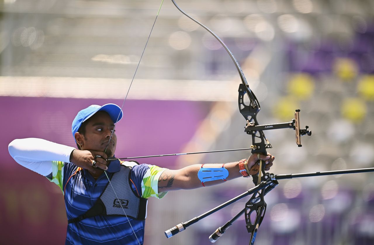 Tokyo 2020 Olympics - Archery - Men’s Individual - 1/16 Finals - Yumenoshima Archery Field, Tokyo, Japan - July 29, 2021. Atanu Das of India in action REUTERS/Clodagh Kilcoyne