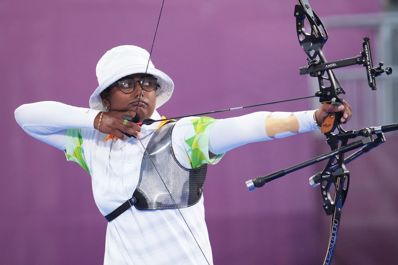 Jul 28, 2021; Tokyo, Japan; World #1 ranked Deepika Kumari (IND) competes against Jennifer Mucino-Fernandez (USA) in the 1/16 elimination round at Yumenoshima Archery Field. Mandatory Credit: Robert Hanashiro-USA TODAY Sports