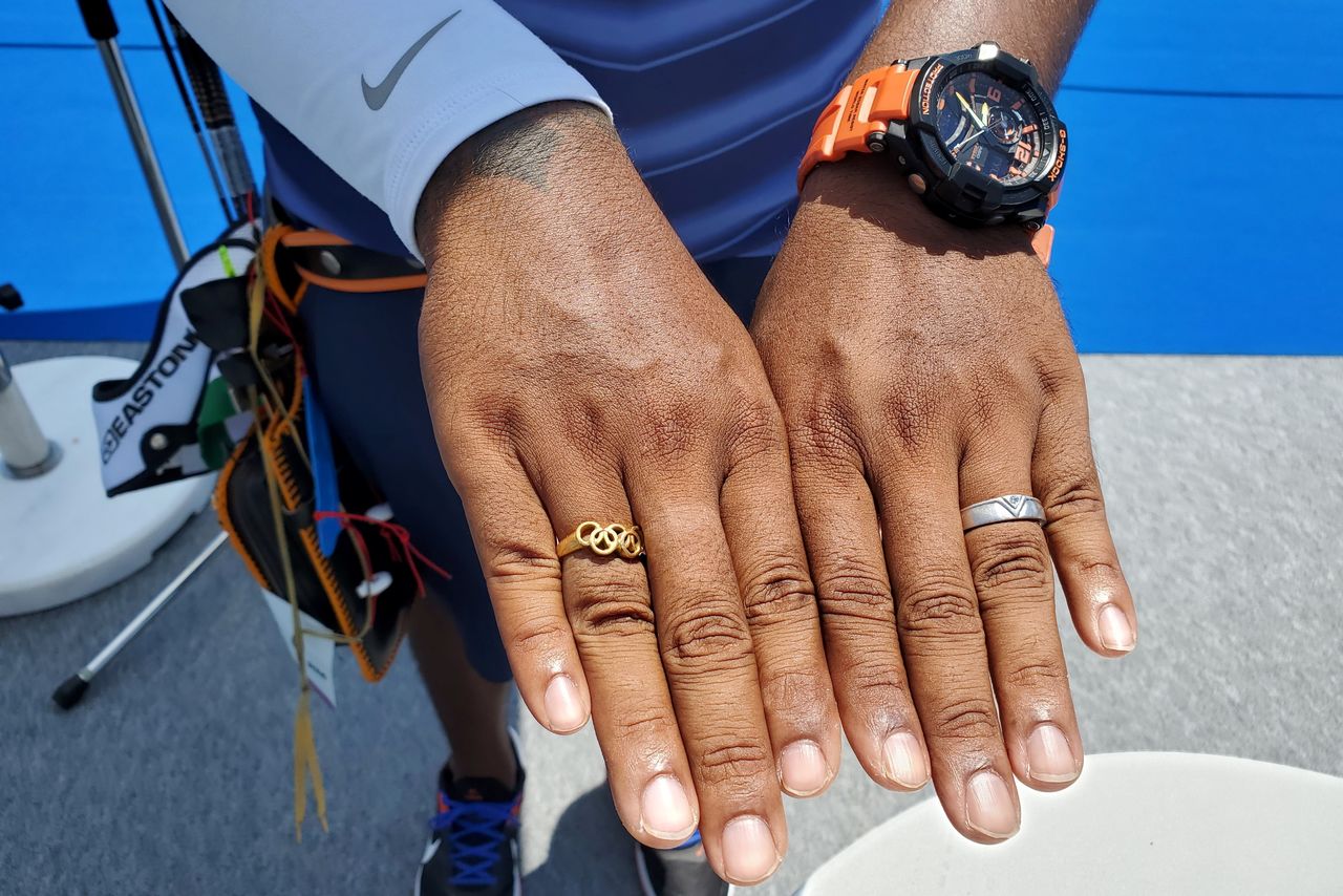 Atanu Das, Indian archer competing in Tokyo 2020 Olympics and husband of Deepika Kumari, a fellow archer who also competes in the Games, shows his wedding ring and his Olympic ring, in Tokyo, Japan July 29, 2021. REUTERS/Ju-min Park
