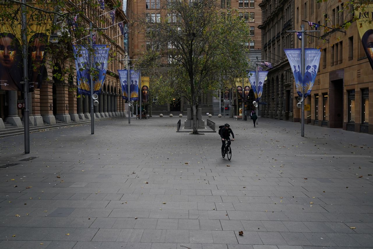 FILE PHOTO: A lone cyclist rides through the empty Martin Place in the city centre during a lockdown to curb the spread of a coronavirus disease (COVID-19) outbreak in Sydney, Australia, July 28, 2021. REUTERS/Loren Elliott