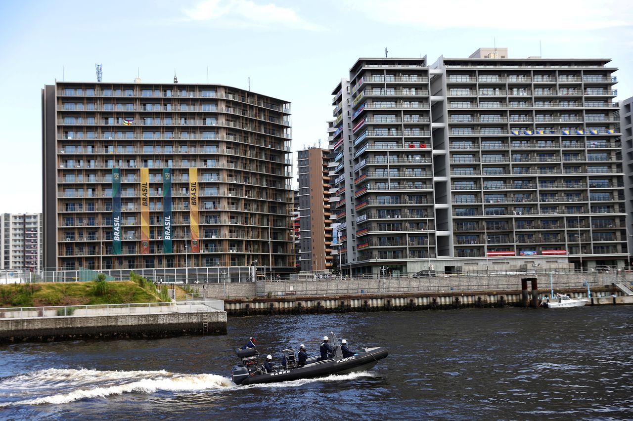 Japan coast guard on a boat patrols around the athletes’ village for Tokyo 2020 Olympic Games in Tokyo, Japan, July 29, 2021. REUTERS/Kim Kyung-Hoon