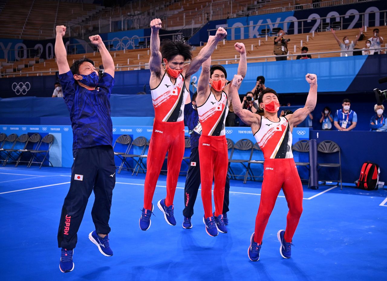 FILE PHOTO : Tokyo 2020 Olympics - Gymnastics - Artistic - Men’s Team - Final - Ariake Gymnastics Centre, Tokyo, Japan - July 26, 2021. Kazuma Kaya of Japan, Takeru Kitazono of Japan and Wataru Tanigawa of Japan wearing protective face masks react REUTERS/Dylan Martinez/File Photo