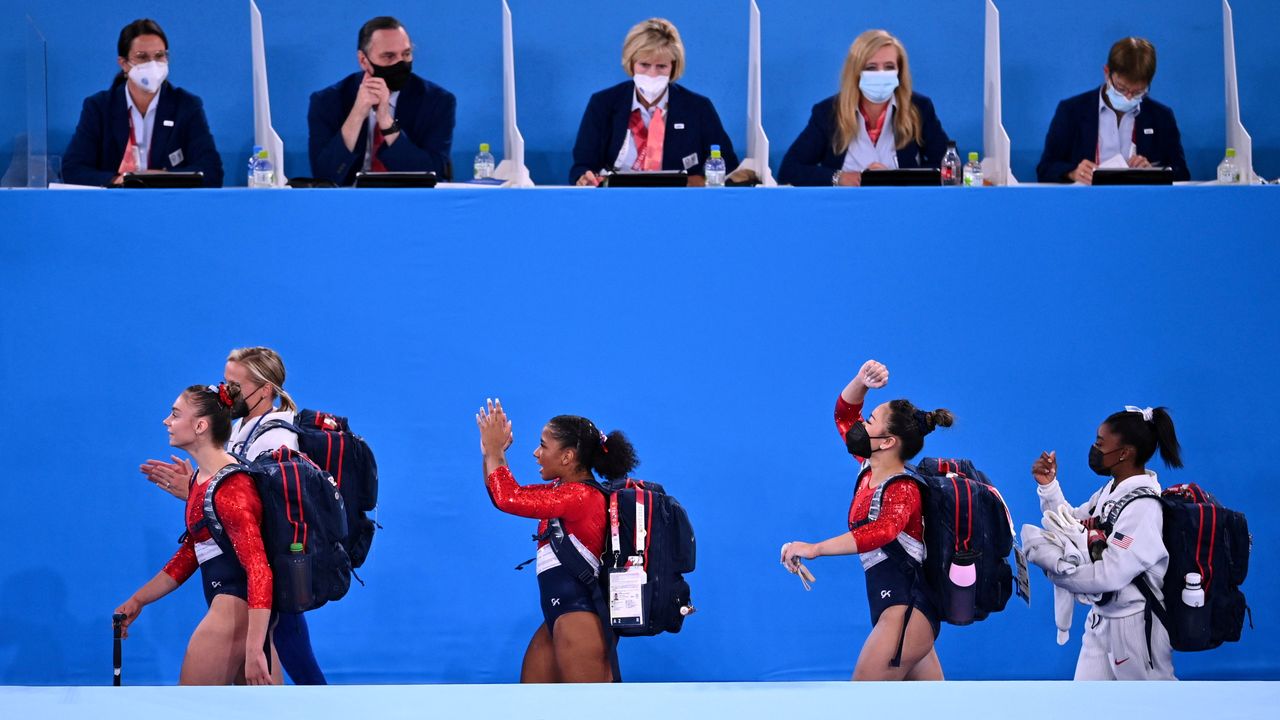FILE PHOTO : Tokyo 2020 Olympics - Gymnastics - Artistic - Women’s Team - Final - Ariake Gymnastics Centre, Tokyo, Japan - July 27, 2021. Grace McCallum of the United States, Jordan Chiles of the United States, Sunisa Lee of the United States wearing a protective face mask and Simone Biles of the United States wearing a protective face mask react as they walk to the final rotation REUTERS/Dylan Martinez/File Photo