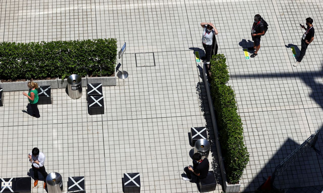 FILE PHOTO: Smokers wait their turn in a queue as they observe social distancing, during a smoke break ahead of the Tokyo 2020 Olympic Games that were postponed to 2021 due to the coronavirus disease (COVID-19) pandemic, in Tokyo, Japan July 22, 2021. REUTERS/Siphiwe Sibeko/File Photo
