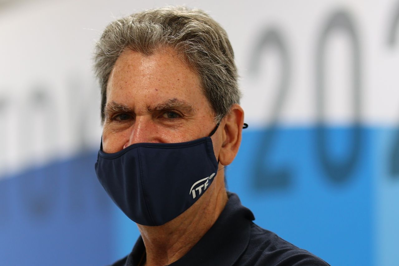 FILE PHOTO: Tokyo 2020 Olympics - Tennis - Women’s Singles - Round 1 - Ariake Tennis Park - Tokyo, Japan - July 24, 2021. XXX in action. International Tennis Federation (ITF) president David Haggerty wearing a mask poses for a picture REUTERS/Mike Segar
