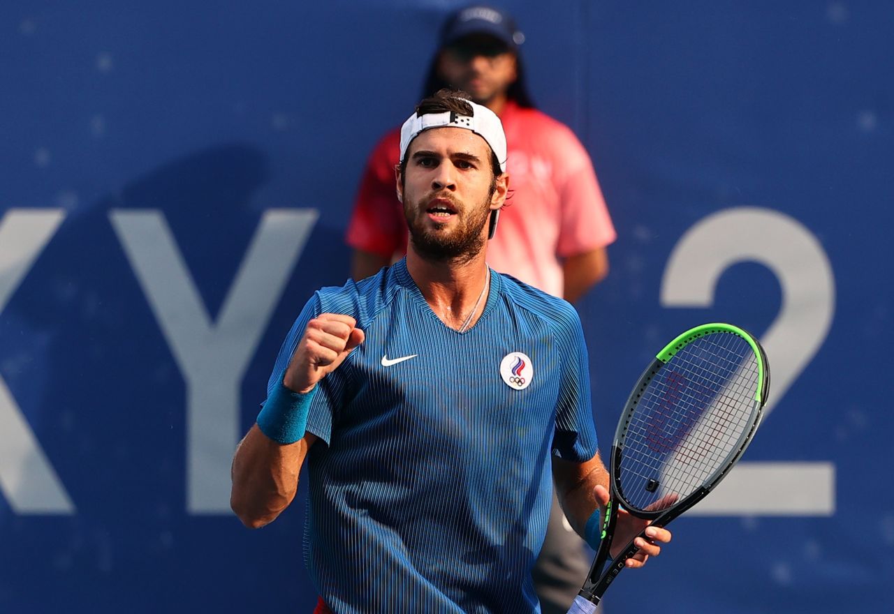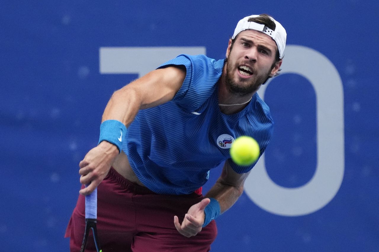 Jul 30, 2021; Tokyo, Japan; Karen Khachanov (ROC) returns a shot from Pablo Carreno Busta (ESP) in the men’s singles semifinals during the Tokyo 2020 Olympic Summer Games at Ariake Tennis Park. Mandatory Credit: Robert Deutsch-USA TODAY Sports