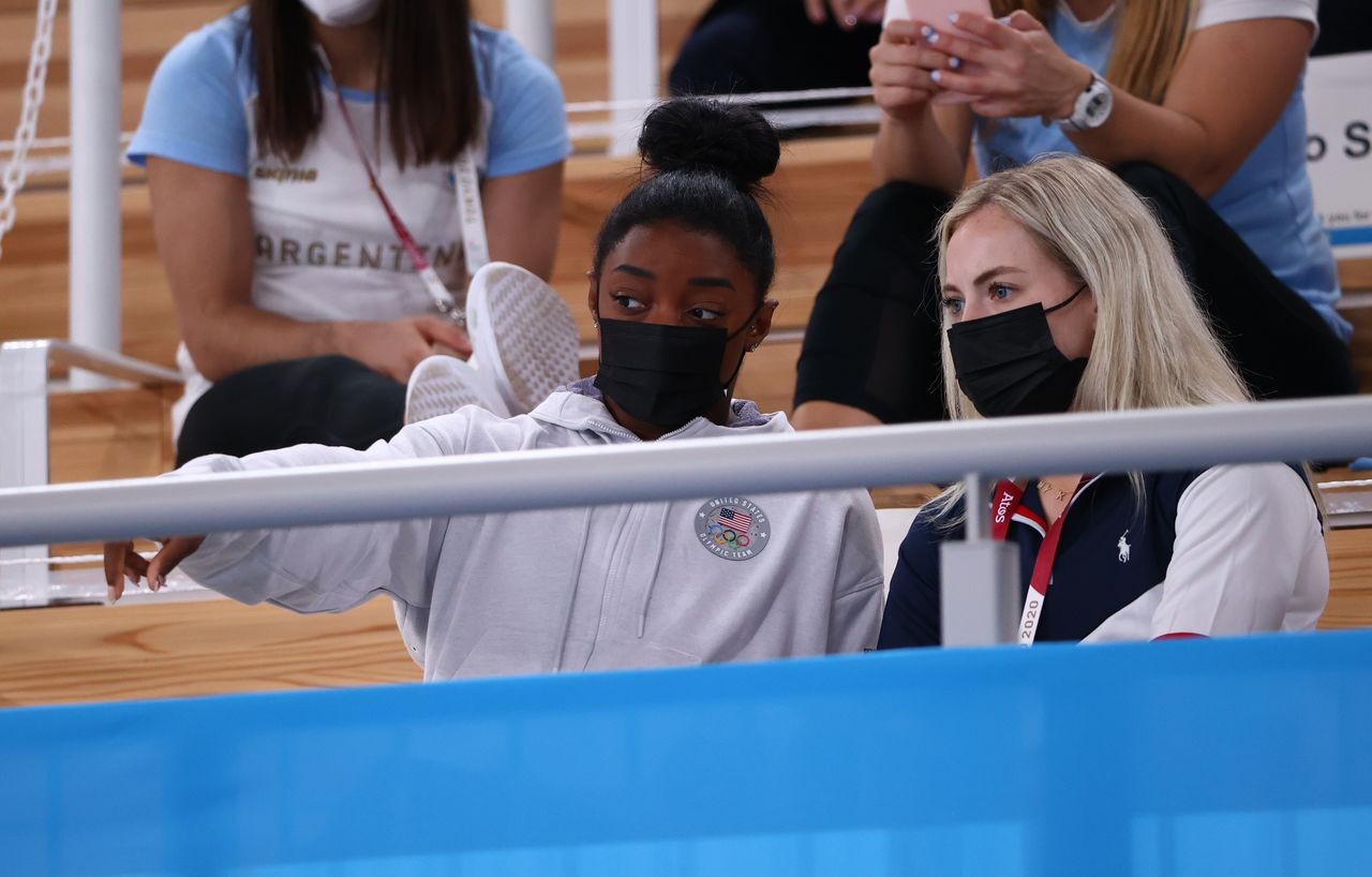 Tokyo 2020 Olympics - Gymnastics - Artistic - Women's Individual All-Around - Final - Ariake Gymnastics Centre, Tokyo, Japan - July 29, 2021. Simone Biles of the United States and Mykayla Skinner of the United States watch their teammates perform. REUTERS/Lindsey Wasson