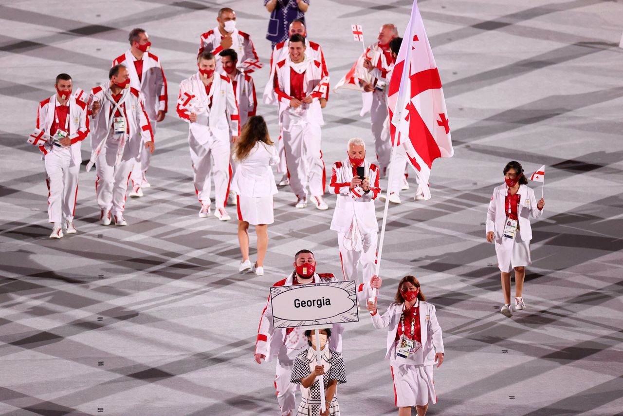FILE PHOTO: Tokyo 2020 Olympics - The Tokyo 2020 Olympics Opening Ceremony - Olympic Stadium, Tokyo, Japan - July 23, 2021. Flag bearers Nino Salukvadze of Georgia and Lasha Talakhadze of Georgia lead their contingent during the athletes parade at the opening ceremony REUTERS/Mike Blake