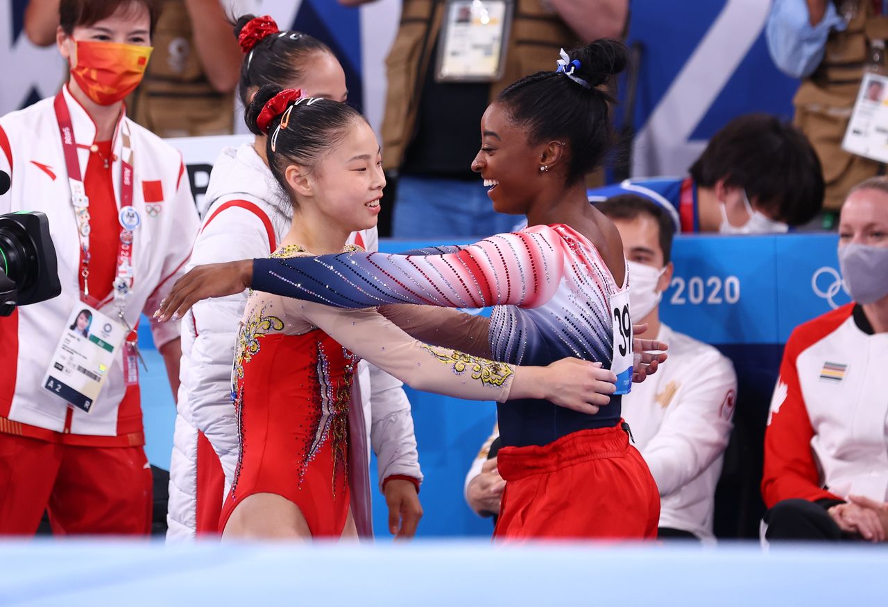 Tokyo 2020 Olympics - Gymnastics - Artistic - Women's Beam - Final - Ariake Gymnastics Centre, Tokyo, Japan - August 3, 2021. Simone Biles of the United States congratulates Guan Chenchen of China after competing REUTERS/Mike Blake