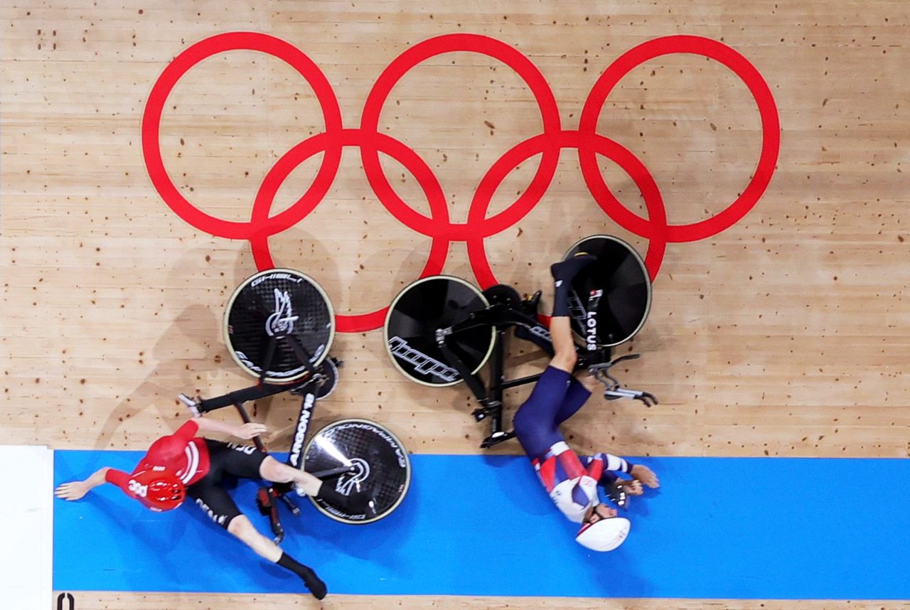 Tokyo 2020 Olympics - Cycling - Track - Men's Team Pursuit - 1st Round - Izu Velodrome, Shizuoka, Japan - August 3, 2021. Charlie Tanfield of Britain crashes with Frederik Rodenberg of Denmark REUTERS/Matthew Childs