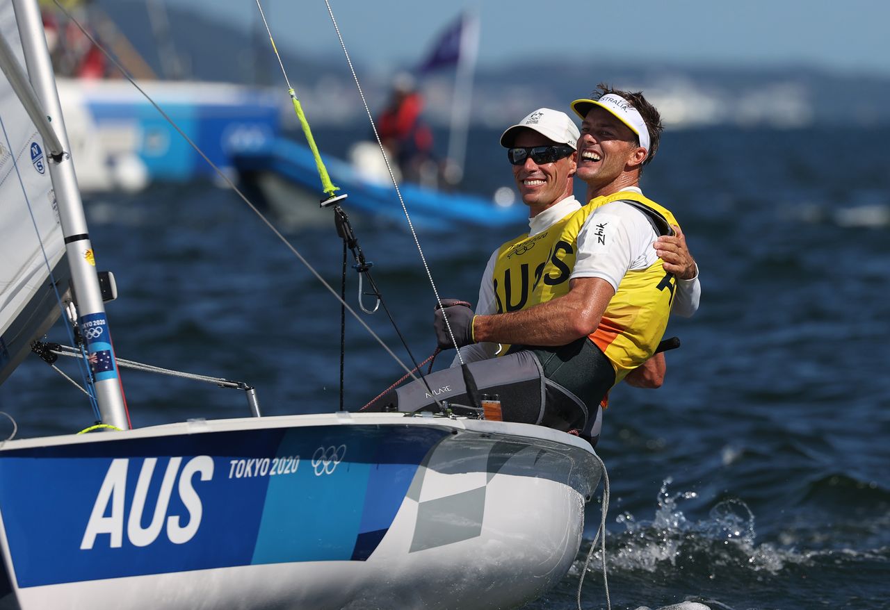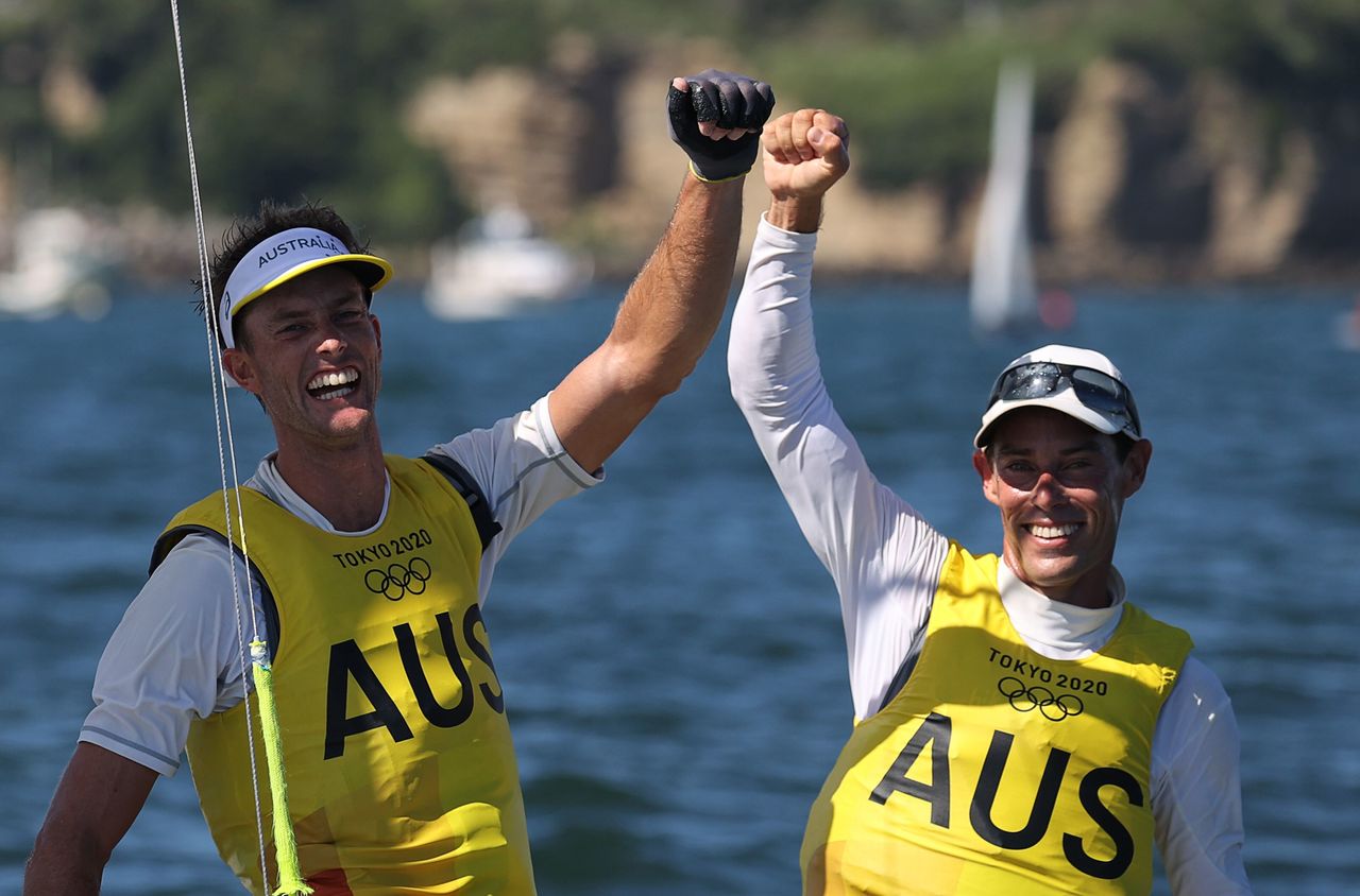 Tokyo 2020 Olympics - Sailing - Men's 470 - Medal Race - Enoshima Yacht Harbour - Tokyo, Japan - August 4, 2021. Mathew Belcher of Australia and Will Ryan of Australia celebrate winning gold after the race. REUTERS/Ivan Alvarado