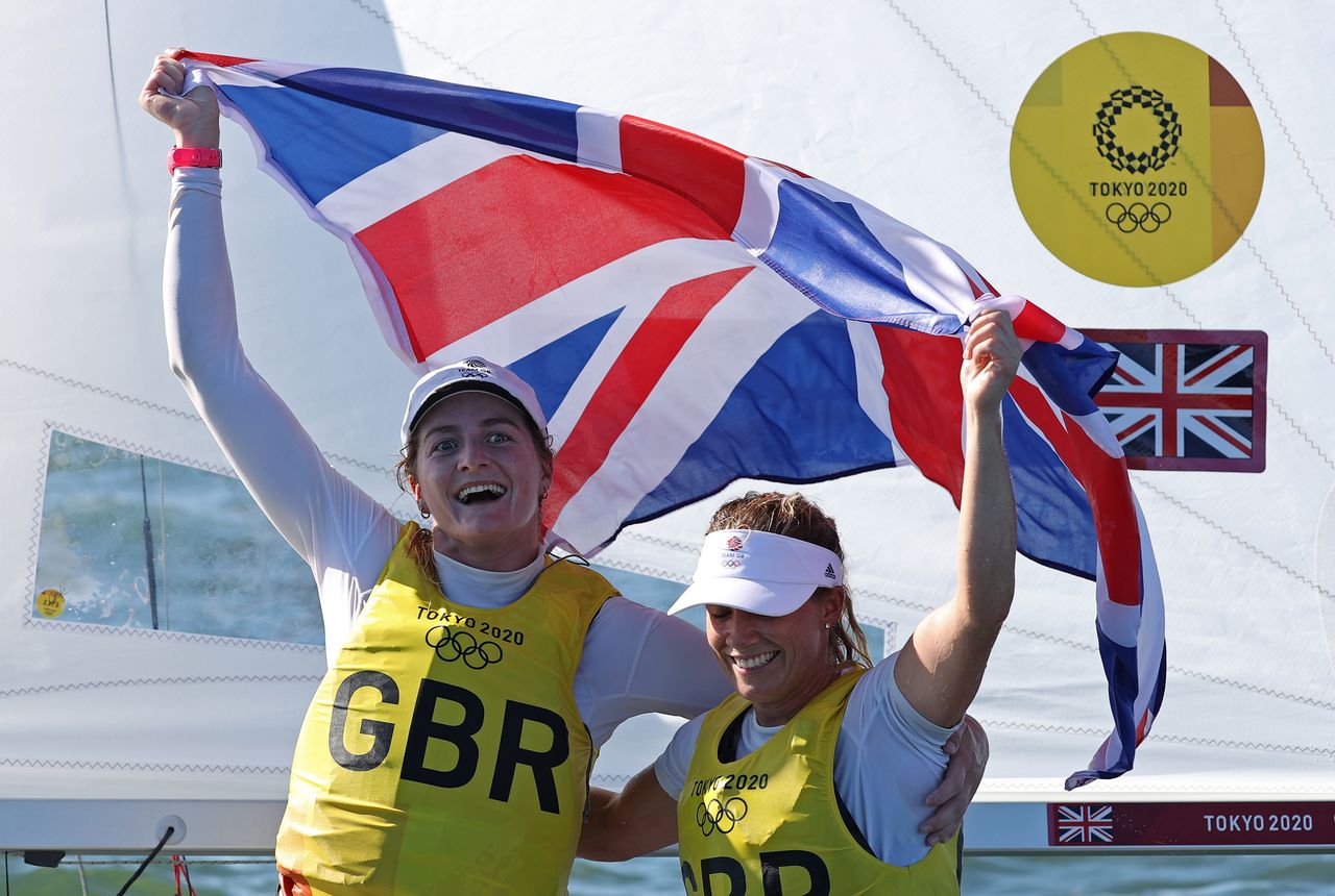 Tokyo 2020 Olympics - Sailing - Women's 470 - Medal Race - Enoshima Yacht Harbour - Tokyo, Japan - August 4, 2021. Hannah Mills of Britain and Eilidh McIntyre of Britain hold their national flag as they react after the race. REUTERS/Ivan Alvarado
