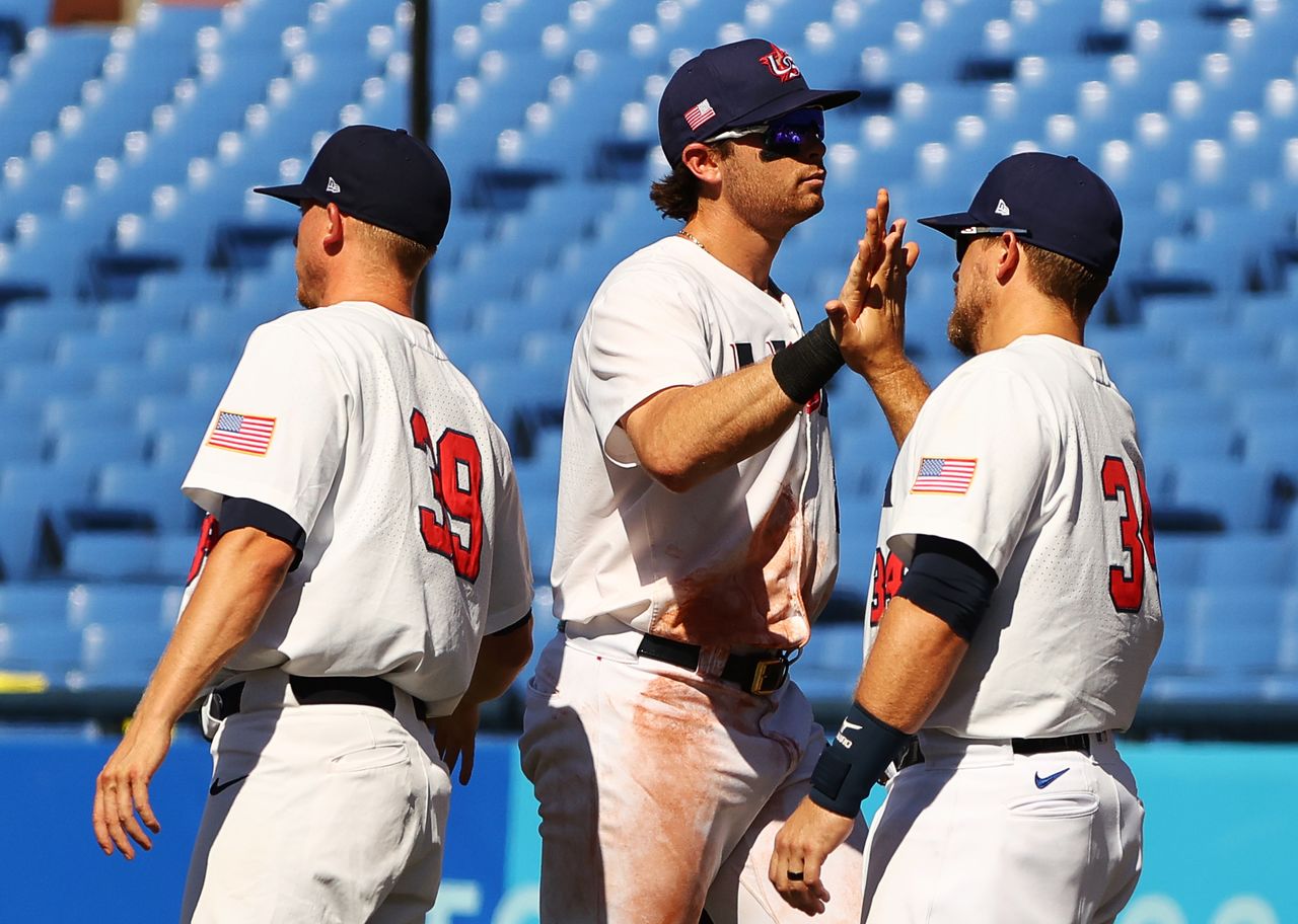 Tokyo 2020 Olympics - Baseball - Men - Round 2 Repechage - Dominican Republic v United States - Yokohama Baseball Stadium, Yokohama, Japan - August 4, 2021. Triston Casas of the United States high-fives Tim Federowicz of the United States and Scott McGough of the United States after winning the game. REUTERS/Jorge Silva