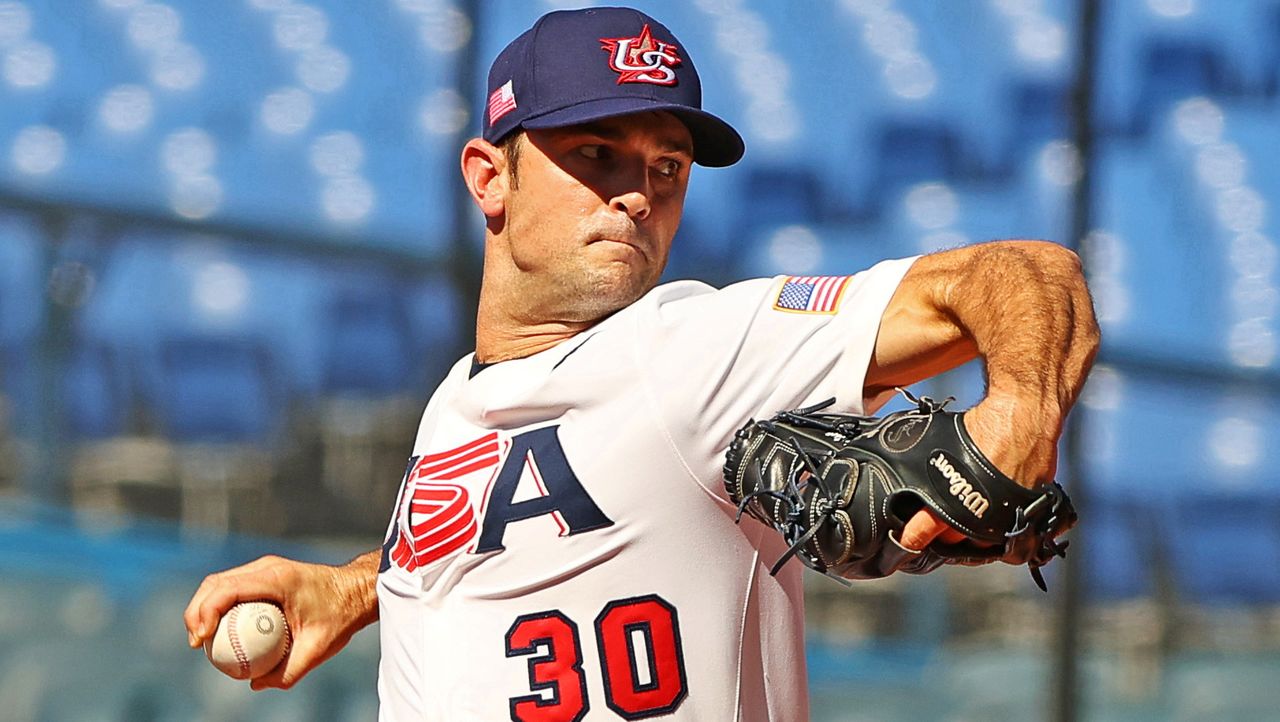 U.S. starting pitcher Scott Kazmir, who came out of a surfing-filled retirement from professional baseball for the Games so his young children could watch him play, threw five scoreless innings.