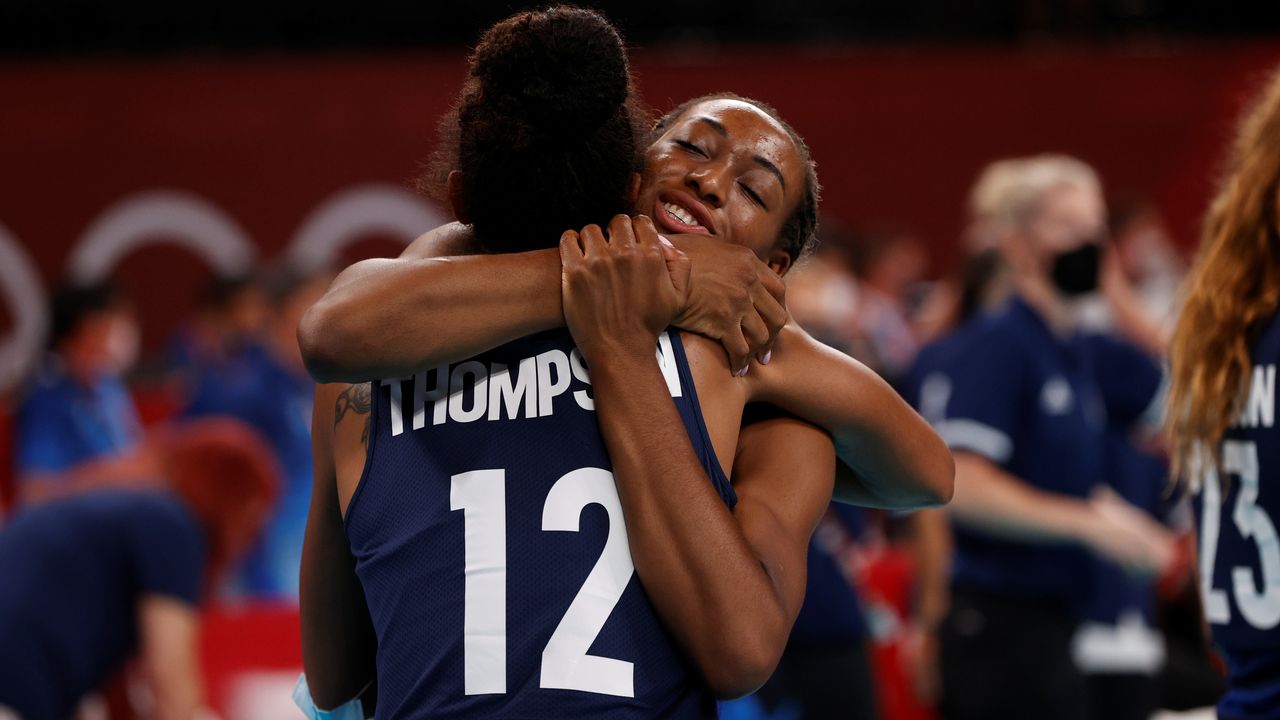 Tokyo 2020 Olympics - Volleyball - Women's Quarterfinal - Dominican Republic v United States - Ariake Arena, Tokyo, Japan – August 4, 2021. Jordan Thompson of the United States and Chiaka Ogbogu of the United States embrace as they celebrate after the match. REUTERS/Valentyn Ogirenko